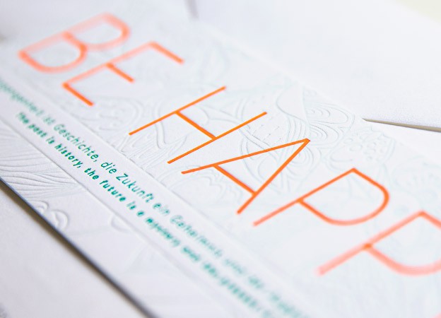 Die außergewöhnliche BE HAPPY Karte ist auf 500 Gramm starken Papier mit einer Letterpress-Maschine gedruckt. Kaum jemand kann sich der Schönheit von den typisch-tiefgeprägten erscheinenden Typografie- und Illustrationsarbeiten entziehen. Die Karten werden mit Farbe gedruckt und, dank der geeigneter Papierqualität, gleichzeitig geprägt. So liefert die BE HAPPY-KARTE eine wunderbare Ästhetik.